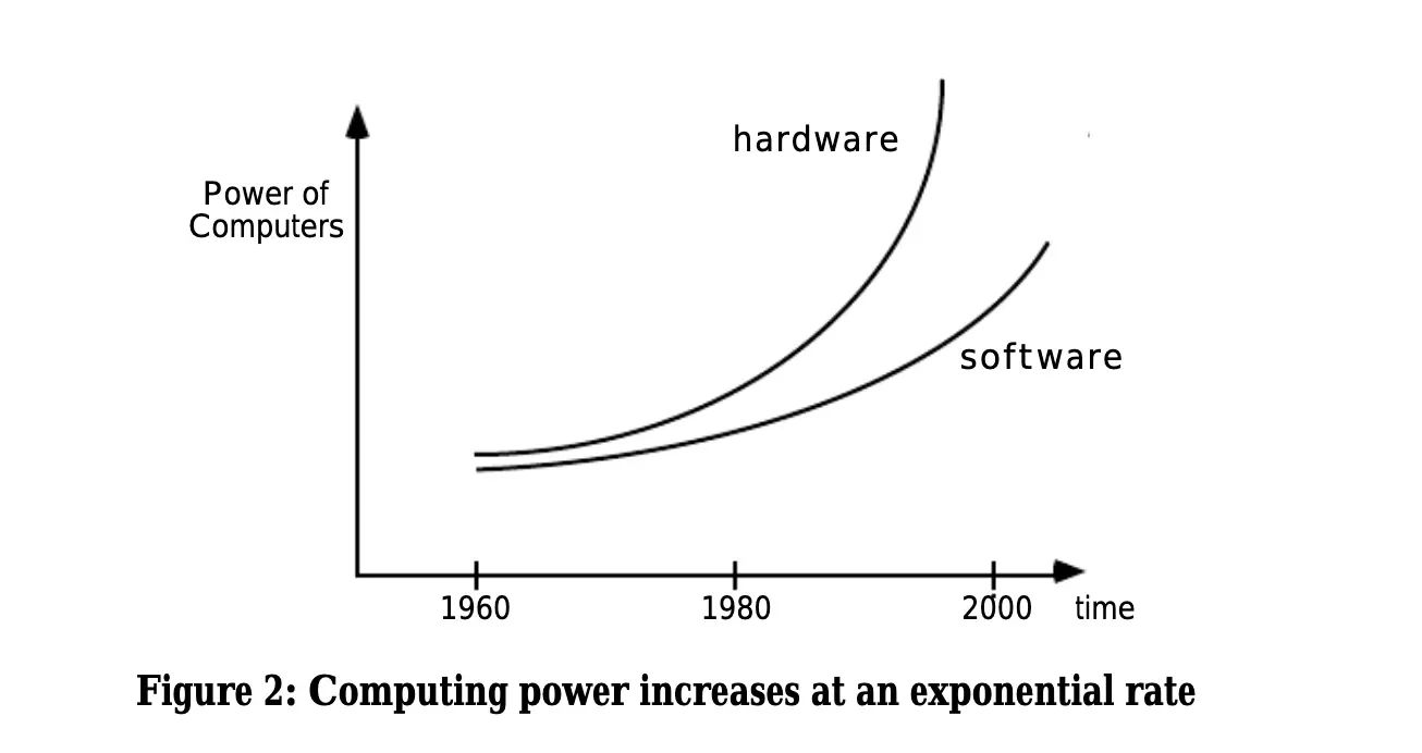Progress is constrained by other factors than just the exponential growth in computing power. We also need our ability to connect, coordinate and control the hardware to also improve over time. And this takes time.