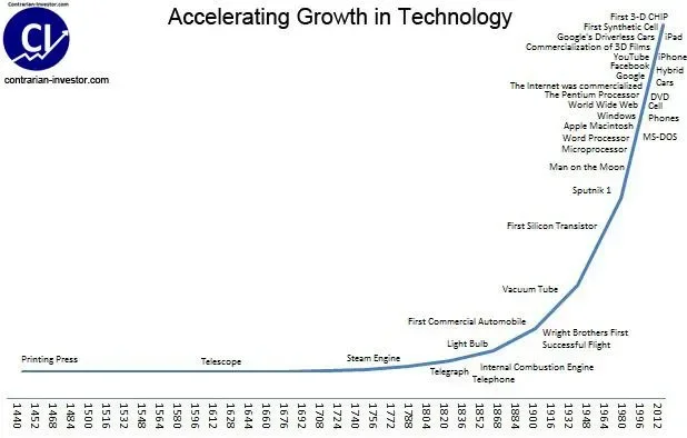 You will have seen a diagram that looks something like this before. Have a look at it. Are we really living in an era of accelerating technology growth? Is the difference between the microprocessor and the 3D chip really 3x the progress from the printing press to the landing on the moon?
