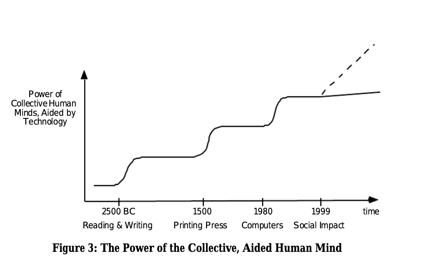 So even though the technology is there, there are limitations driven by human ingenuity, capacity and collaboration. He then goes on to describe how the power of collective human minds rise in phased stages, driven by improvements in collaboration and coordination technology.